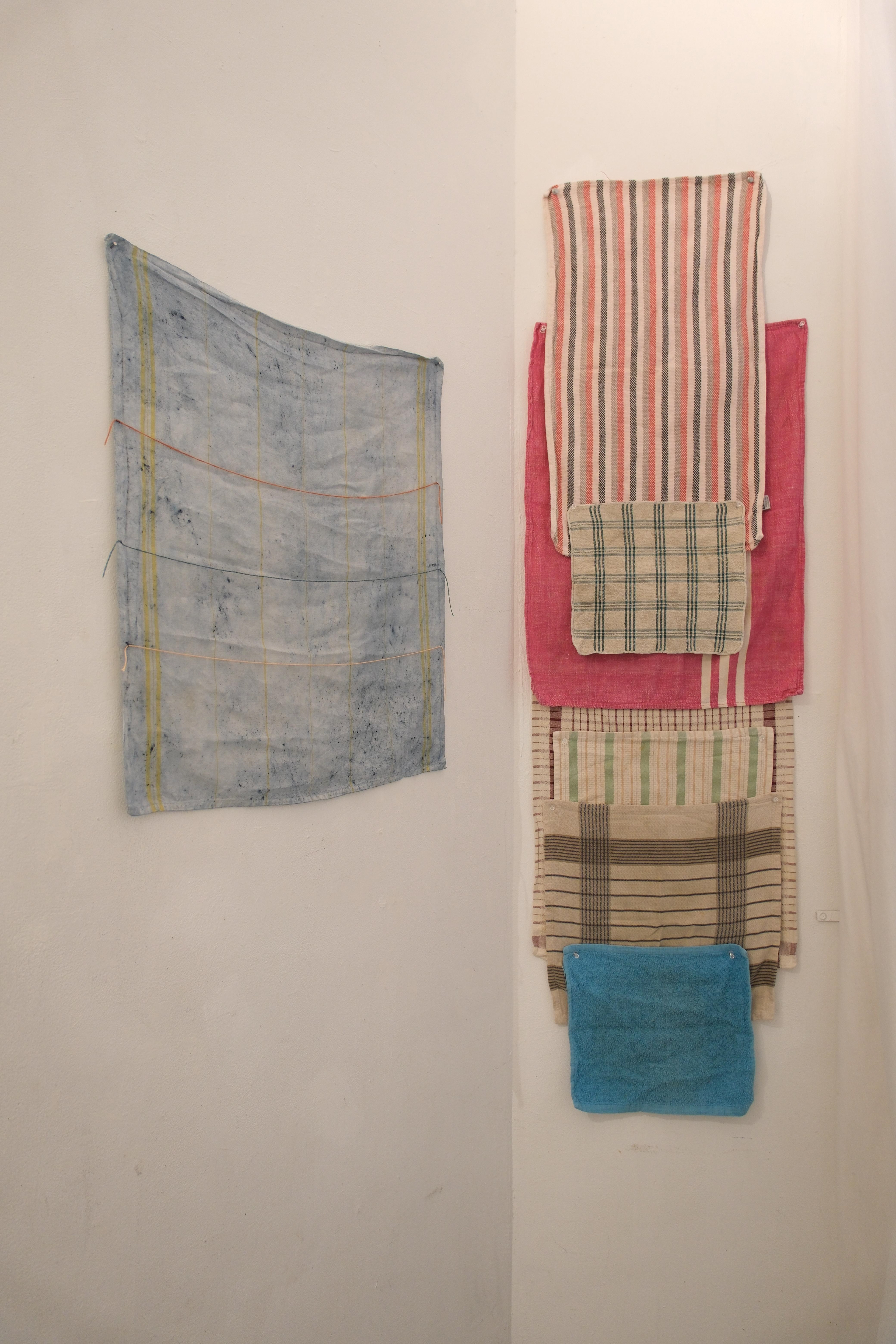 This installation combines industrially produced dye samples with personal and spiritual drawings, as well as photographs of my mother and child, creating a sense of community within the space.